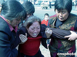 據(jù)國家安監(jiān)局網(wǎng)站消息,河南省鄭州煤電(集團(tuán))有限責(zé)任公司大平煤礦二十日二十二時(shí)十分發(fā)生的瓦斯突出事故截止25日20:30已找到122名遇難者,仍有26人被困于井下。救援工作仍在進(jìn)行之中。圖為在礦難現(xiàn)場外悲痛欲絕的大平礦難家屬。作者:王迪