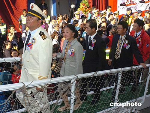 香港律政司司長梁愛詩等嘉賓登上“雪龍?zhí)枴逼票?#65104;并在鄧小平題詞下合影。