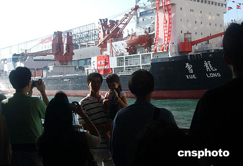 中國破冰船“雪龍?zhí)枴钡诌_香港補給并停泊在尖沙咀海運碼頭,這艘唯一能在極地航行的破冰船,冀三日的訪港活動,擴闊港人視野!把?zhí)枴睂⒊掏蠘O挑戰(zhàn)南極的最高點,這將是中國人首次深入南極內陸一千三百公里,創(chuàng)造中國南極考察史新紀錄。圖為10月30日大批香港市民前來圍觀“雪龍?zhí)枴逼票。作?尚金生