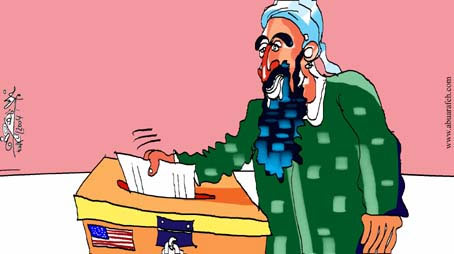 中新網(wǎng)11月1日電 10月29日晚,銷聲匿跡一年多的本拉登,在美國大選投票日來臨的前四天突然拋頭露面了。在半島電視臺播放了本拉登講話的錄像帶之后,分析家一致認(rèn)為拉登此次露面是為了給美國大選施加影響,試圖影響美國大選的最終結(jié)果。半島電視臺網(wǎng)站于今日發(fā)表了一幅漫畫,在這幅漫畫當(dāng)中,本拉登被描繪成一個重量級選民,他的講話被戲稱作是在為美國總統(tǒng)大選提前投票。(章田)