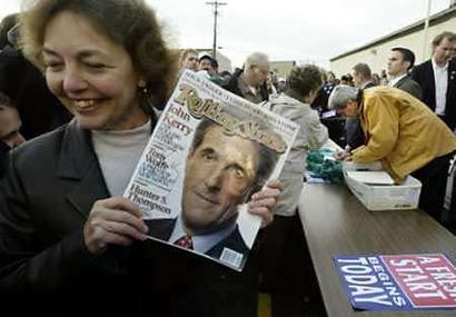 圖為2日當天克里在威斯康星州分發(fā)競選宣傳材料的一個場景,克里的一名女支持者手里拿著的雜志,是民主黨總統(tǒng)候選人克里簽過名了的一本競選宣傳資料。(固山)