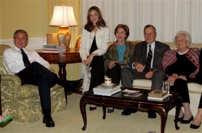 中新網(wǎng)11月3日電 據(jù)美聯(lián)社報道,11月2日晚,在白宮,布什總統(tǒng)正與他的家人靜靜地等待大選結(jié)果。從左至右分別是女兒芭芭拉、夫人勞拉、以及他的父親,前總統(tǒng)老布什和夫人芭芭拉·布什。(春風(fēng))
