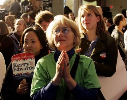 中新網(wǎng)11月3日電 據(jù)美聯(lián)社報(bào)道,美國(guó)東部時(shí)間2004年11月2日(北京時(shí)間11月3日),在賓西法尼亞州東南部城市費(fèi)城舉行的美國(guó)民主黨賓州總部選舉集會(huì)上,民主黨總統(tǒng)候選人克里的支持者神情焦慮,十分緊張地盯著大廳里的計(jì)票牌。站在最前面的綠衣金發(fā)婦女雙手合十,在心中默默在為克里祈禱,希望他能夠獲得今年的總統(tǒng)大選。(固山)