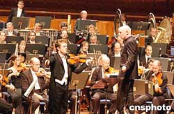 法國文化年廣東省開幕式暨巴黎交響樂團(tuán)首次訪穗音樂會,十一月四日晚在廣州星海音樂廳舉行。由一百三十三位成員組成的巴黎交響樂團(tuán)傳神地演繹了多首世界名曲。圖為著名指揮家克里斯托夫·艾森巴赫與小提琴家雷諾·卡皮桑在演出中。作者:劉衛(wèi)勇