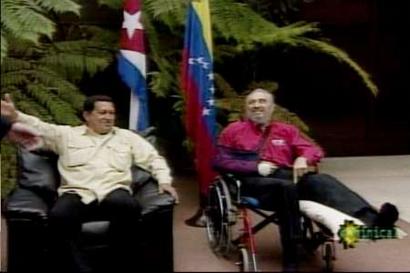 新聞報(bào)道稱,卡斯特羅與查維斯在上星期六晚上舉行了八個(gè)小時(shí)的會(huì)談。電視臺(tái)的畫面顯示,卡斯特坐在輪椅上,他的腿打了石膏,胳膊也用懸?guī)У踔?/p>