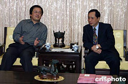 11月8日,大陸美術(shù)專業(yè)人士訪問團(tuán)參訪了臺(tái)北故宮。圖為訪問團(tuán)團(tuán)長(zhǎng)、中國(guó)美術(shù)館館長(zhǎng)馮遠(yuǎn)(左)與臺(tái)北“故宮博物院”副院長(zhǎng)林柏亭交談,表示將加強(qiáng)交流與合作。中新社記者:董會(huì)峰