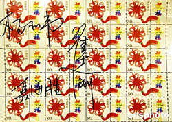 由中國航天第一人楊利偉及飛天預選航天員聶海勝、瞿志剛親筆簽名,并隨“神州五號”一起遨游太空的《神五搭載紀念郵票》,十一月九日亮相申城。圖為該郵票三個整版之一的同心結版。作者:湯彥俊
