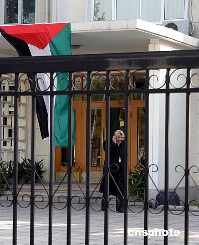 十一月十一日下午,北京的巴勒斯坦國(guó)駐華使館已經(jīng)降半旗,向逝世的阿拉法特主席致哀。中新社記者:史利