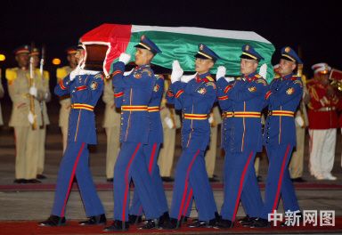11月11日晚,巴勒斯坦領(lǐng)導(dǎo)人阿拉法特的遺體由法國航空公司一架A-319型飛機運抵埃及首都開羅機場。