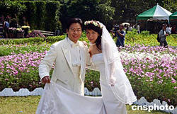 11月12日,臺北市士林官邸舉辦大型菊展,吸引了數(shù)以千計的民眾觀賞。圖為一對新人在菊花叢前拍攝婚紗照,場面溫馨浪漫。中新社記者:董會峰