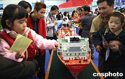 重慶高新技術(shù)交易會展出一艘四點(diǎn)六萬噸級的成品油輪船艦?zāi)P臀齾⒂^者