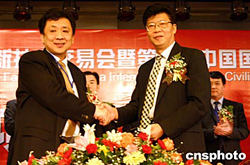 圖為重慶市副市長吳家農(nóng)和中國航天科技集團(tuán)公司總經(jīng)理助理芮曉武簽訂合作協(xié)議。