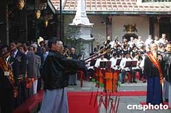今天上午十時(shí)三十分,本社記者來(lái)到臺(tái)北市大龍峒保安宮。這里香火繚繞,正在舉行富有道家特色的三獻(xiàn)禮大典。在莊嚴(yán)肅穆的三通鼓后,迎神、進(jìn)饌、上香、三獻(xiàn)禮依次進(jìn)行。保安宮合唱團(tuán)及樂(lè)團(tuán)吟唱《保生大帝靈跡歌》,宣揚(yáng)保生大帝的保生護(hù)民、慈悲胸襟。
