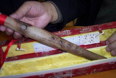 據(jù)收藏者介紹,“這支陶笛為商周時(shí)期文物,中國(guó)目前只有這一支,就連中國(guó)歷史博物館里也沒(méi)有!庇浾呖吹,陶笛長(zhǎng)20多厘米,大小如蠟燭一般。和普通的竹笛不同的是,它不但是陶制的,而且兩端封口,笛筒并不像一般的笛子那樣均勻,而是呈中間大兩端小的形狀。奇特的是,它的氣孔下面只有4個(gè)音孔。主人說(shuō),由于中國(guó)古代的音樂(lè)不成熟,所以管樂(lè)的音孔最早只有一個(gè),后來(lái)到唐代才發(fā)展到了6音孔!澳銊e看只有4個(gè)音孔,但音階很全,古樂(lè)、民樂(lè)都能演奏。”說(shuō)著,他拿起這支陶笛,吹起了《小河淌水》、《青春舞曲》。聽(tīng)到3000多年前的樂(lè)器發(fā)出迷人聲音,現(xiàn)場(chǎng)的人都陶醉了。