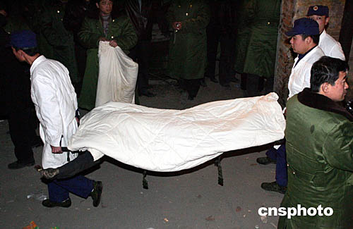 二零零四年十一月二十一日晚,經(jīng)過連續(xù)搜索搶救,河北省邢臺(tái)市沙河礦難死亡人數(shù)又有所增加,又有十多名礦工的遺體被抬出金鼎鐵礦巷口。中新社記者:武仲林