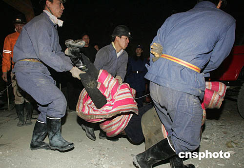 中新社沙河十一月二十二日電(記者孫宇挺)今天下午六點(diǎn)半,伴隨著一聲尖銳的信號(hào)鈴聲,位于著火點(diǎn)的白塔鎮(zhèn)章村李生文礦的八位受困人員開始升井,十五分鐘以后,所有八具用棉被包裹的尸體全部從白塔鎮(zhèn)二鐵礦直井口運(yùn)出,至此,河北沙河市“一一·二0”礦難事故死亡人數(shù)上升至五十七人,此次礦難事故中受圍困的一百零六人仍有三人下落不明。