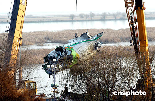 圖:包頭失事客機(jī)機(jī)尾被吊出水面