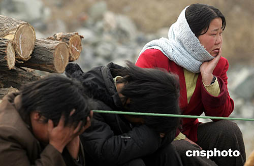 二零零四年十一月二十二日,“11.20”河北沙河礦難救援工作仍在進(jìn)行。截止當(dāng)日十九時(shí)三十分,河北沙河礦難遇難礦工人數(shù)已達(dá)五十七人,另有三人人下落不明。圖為仍沒(méi)有獲救的遇難礦工家屬在礦井附近焦急等待。中新社記者:武仲林