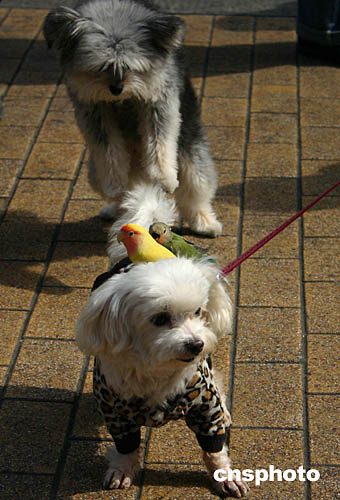 日本導(dǎo)盲犬電影《再見了,可魯》在臺(tái)灣上映首周,不僅票房突破三千萬(wàn)新臺(tái)幣,而且在臺(tái)灣島內(nèi)掀起一股“可魯熱”。圖為一只小狗在主人牽引下“馱”著兩只小鳥悠然漫步臺(tái)北街頭,還惹得一只貓咪湊近觀看。中新社記者:董會(huì)峰