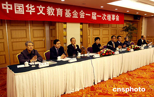 中國(guó)華文教育基金會(huì)一屆一次理事會(huì)十一月二十五日在北京世紀(jì)飯店舉行,二十三位理事和監(jiān)事出席會(huì)議。會(huì)議審議并通過了中國(guó)華文教育基金會(huì)章程(草案),確立了基金會(huì)首批募捐和資助項(xiàng)目并選舉了理事長(zhǎng)、秘書長(zhǎng)。中新社記者:史利