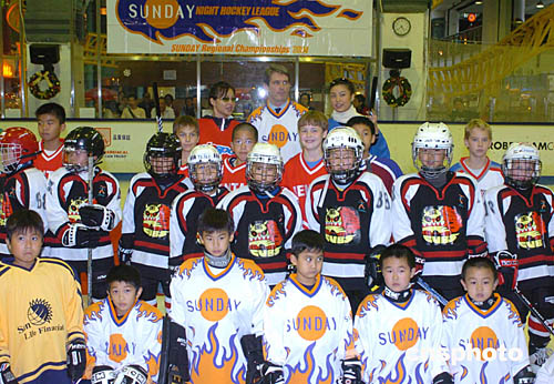 2004年亞太區(qū)少兒冰球賽25日在香港西九龍中心舉行﹐北京尚美虎仔隊(duì)(黑衣)以六比零戰(zhàn)勝香港隊(duì)。