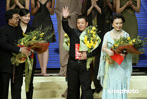 中國(guó)國(guó)際時(shí)裝周第八屆中國(guó)時(shí)裝設(shè)計(jì)“金頂獎(jiǎng)”十一月二十五日晚在北京揭曉,“云敦至尊”品牌設(shè)計(jì)師計(jì)文波(中)摘得桂冠。中新社記者:盛佳鵬