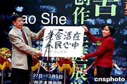 為紀念老舍先生誕辰一百零五周年,由中共廣州市委宣傳部、中國老舍研究會與中國現(xiàn)代文學館聯(lián)合舉辦的《老舍文學創(chuàng)作生涯展覽》十一月二十七日在廣州藝術(shù)博物院隆重開幕。著名漫畫家廖冰兄先生書寫的《老舍活在人民心中》賀詞由女兒廖凌兒代贈送給老舍先生之子舒乙教授。作者:劉衛(wèi)勇