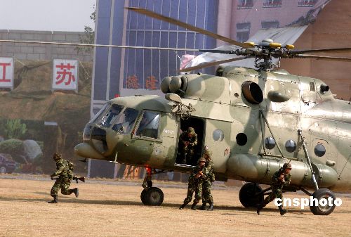反恐應(yīng)急分隊(duì)機(jī)降突擊隊(duì)搭乘運(yùn)輸直升機(jī)機(jī)降后迅速組織戰(zhàn)斗 。