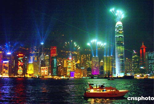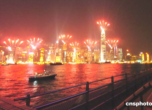 為迎接圣誕節(jié)的到來﹐周日的香港島主要建筑物在晚間20時燃放煙花﹐使得維多利亞港灣呈現(xiàn)一派節(jié)日景象。