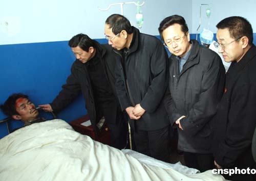 國務(wù)院副秘書長尤權(quán)(右三)、陜西省代省長陳德銘(右四)等29日上午到礦務(wù)局醫(yī)院慰問脫險礦工。作者:任晨鳴