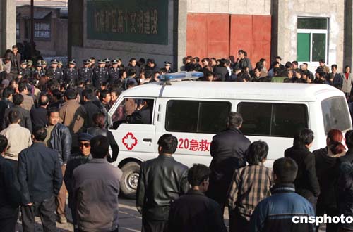 十一月二十九日下午,救護車在發(fā)生瓦斯爆炸事故的陜西銅川礦務(wù)局陳家山煤礦外待命,隨時準備救治至今下落不明的礦工。作者:任晨鳴