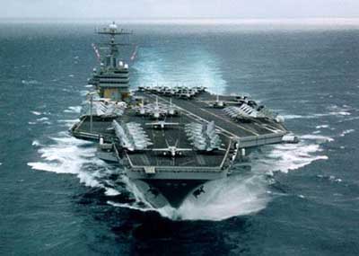 “尼米茲”號(hào)航母的主要?jiǎng)恿ρb置為2座核反應(yīng)堆及4臺(tái)蒸汽輪機(jī),推進(jìn)功率20.9萬(wàn)千瓦,最大航速為30節(jié)。其主要武器系統(tǒng)為3座8聯(lián)裝“海麻雀”艦對(duì)空導(dǎo)彈發(fā)射裝置、3座“密集陣”近戰(zhàn)武器系統(tǒng)及SPS-49對(duì)空搜索雷達(dá)。該艦攜帶艦載機(jī)85架,F(xiàn)-14“雄貓”戰(zhàn)斗機(jī)、F/A-18“大黃蜂”戰(zhàn)斗/攻擊機(jī)、EA-6B“徘徊者”電子戰(zhàn)飛機(jī)、E-2C“鷹眼”預(yù)警機(jī)和S-3“海盜”反潛機(jī)等。(章田/雅龍)