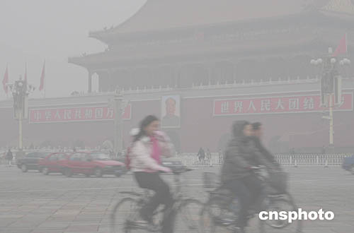 十二月二日清晨,北京天安門城樓和長安街籠罩在濃重的霧氣當(dāng)中。北京連日來遭遇大霧天氣,首都機場眾多飛機航班延誤,京開、京沈、京津、京石等高速公路相繼關(guān)閉,城市道路能見度降低,交通事故明顯增多。中新社記者:毛建軍
