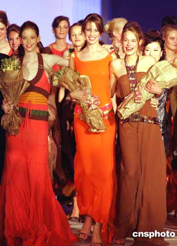 十二月二日晚,二○○四世界精英模特大賽國(guó)際總決賽在上海舉行,荷蘭選手Sofie OOSTERWAAL(圖右)獲得冠軍,美國(guó)選手Dana MARCOLINA(圖中)獲得亞軍,丹麥選手Maj BJERRE獲得季軍。作者:湯彥俊