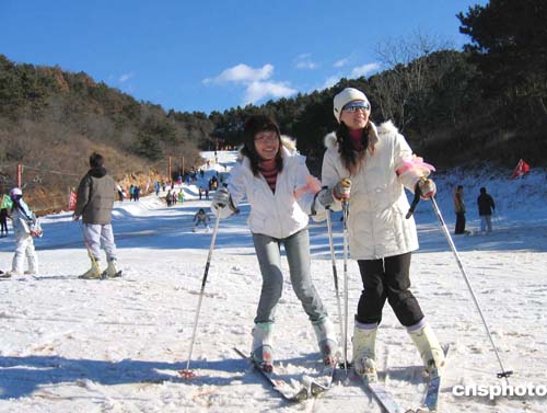一場清風(fēng)吹散了持續(xù)三日的大霧,北京十二月四日迎來了藍(lán)天白云的好天氣。許多北京市民紛紛涌至郊區(qū)滑雪場放飛心情。僅北京密云云佛山滑雪場就迎來了上萬名滑雪愛好者。圖為兩名女青年在滑雪場盡情嬉戲。作者:吳慶才