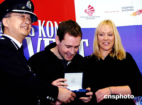 香港旅發(fā)局主席周梁淑怡與香港入境事務(wù)處機場管制科指揮官蔡普特,今天在機場舉行歡迎儀式,向芭芭拉頒發(fā)證書,贈送香港旅游發(fā)展局水晶帆船等紀念品,共祝香港旅游邁進新旅程。