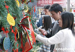 圣誕節(jié)臨近,福州市區(qū)節(jié)日氣氛漸濃。十二月六日,兩對(duì)有情人正往市區(qū)一大型商場(chǎng)前樹(shù)立的圣誕樹(shù)上懸掛許愿祈?ǎ涡履晷泻眠\(yùn)。作者:劉可耕