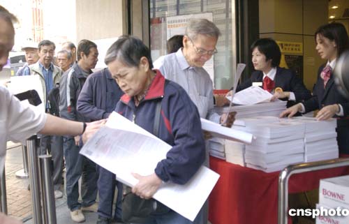 中新社香港十二月六日電 香港首個(gè)房地產(chǎn)基金“領(lǐng)匯房地產(chǎn)投資信托基金”,今起派發(fā)申請(qǐng)表接受市民認(rèn)購。因回報(bào)息率高等因素,領(lǐng)匯基金一直受捧,有市民一大早即到發(fā)表的銀行外排隊(duì)等候。