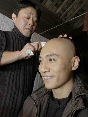 答:那是戴頭套的。這個戲是我第一次剃頭,因為要粘上長辮子,不然就粘不穩(wěn)。