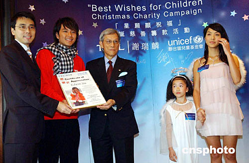 為《中國兒童周》教育項目籌募經費。聯合國兒童基金會香港委員會主席馮慶彪、謝瑞麟執(zhí)行董事陳偉康[左]向明星蕭正楠頒贈感謝狀,感謝蕭正楠應邀擔任親善之星。