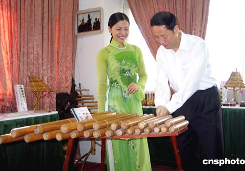 圣誕、新年前夕前往越南旅游的各地游客日益增多,越南的人文景觀及傳統(tǒng)文化吸引不少游客。圖為女藝人教導游客擊掌演奏排管樂曲。作者:周景洛