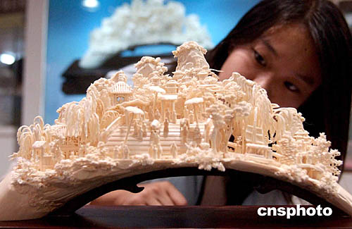 十二月十日,一座長47厘米、高24厘米的精美《清明上河圖》象牙雕刻工藝橋,亮相王府井工美大廈四層玉石文化商場。該作品選取明代張擇端《清明上河圖》畫卷中的一個場景,具有很高的藝術欣賞價值和收藏價值。象牙素有“白色的金子”之美譽,因其資源的稀缺性、制品的珍貴性,為收藏價值預留了無限空間。作者:韓藝冰