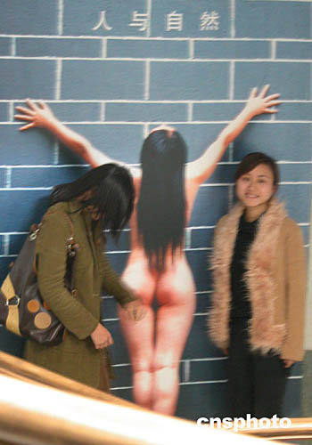 12月11日,在長沙舉辦的湖南“人與自然”人體攝影展展廳,一名女生(右)欣然站在一幅裸體作品前合影,而另一名經(jīng)過的女生則不敢正視含羞低頭走過。這是湖南首次舉辦人體藝術(shù)攝影展,共展出作品140幅。作者:劉雙雙