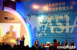 博鰲亞洲論壇二○○四深圳國(guó)際物流大會(huì),十二月十一日在深圳五洲賓館開(kāi)幕。博鰲亞洲論壇理事長(zhǎng)、菲律賓前總統(tǒng)拉莫斯,秘書(shū)長(zhǎng)龍永圖,新加坡交通部長(zhǎng)姚照東等出席論壇。作者:陳文