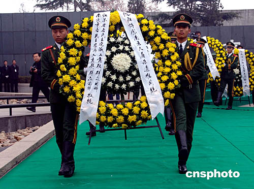 圖為各界人士在安魂曲的凄婉中向遇難同胞敬獻(xiàn)花圈。