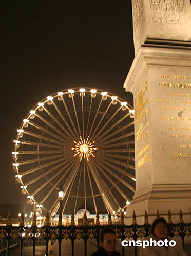| 高四十米的巴黎摩天輪十二月中旬由當(dāng)?shù)匾还珗@搬到巴黎市中心協(xié)和廣場,并將于十八日開始運(yùn)行。據(jù)悉,新年除夕夜摩天輪將進(jìn)行主題為“申辦2012年奧運(yùn)會(huì)”的煙火表演。圖為協(xié)和廣場方尖碑旁正在調(diào)試中的巴黎摩天輪。作者:鐘誠