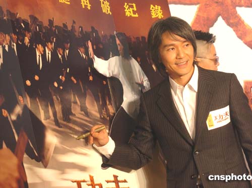 由周星馳自編﹑自導(dǎo)﹑自演耗時(shí)兩年多拍攝的影片《功夫》16日晚在香港時(shí)代廣場舉行首映開幕禮﹐在片中擔(dān)任主要角色的周星馳在“影片”《功夫》上簽名,該片將在12月23日在全球上映。作者:趙振清