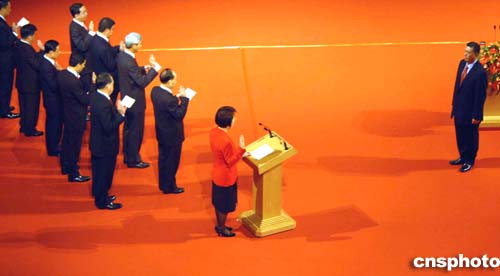 澳門特別行政區(qū)第二屆政府主要官員宣誓就職,行政長(zhǎng)官何厚鏵監(jiān)誓。作者:梁永強(qiáng)