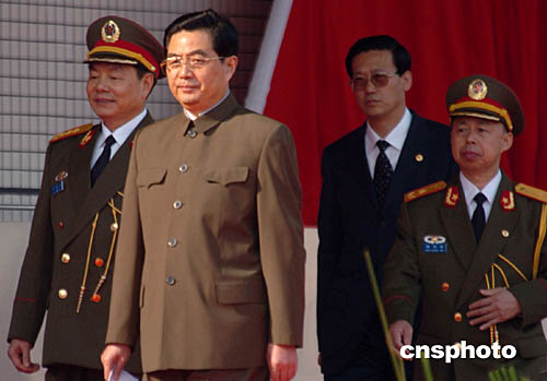 中新社澳門十二月二十日電(記者孫宇挺)今天下午十四點四十五分,中共中央總書記、國家主席、中央軍委主席胡錦濤來到(乙+水)仔軍營,視察中國人民解放軍駐澳門部隊營區(qū)并閱兵。