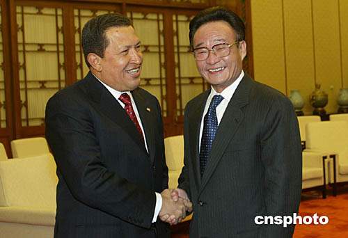 吳邦國說,兩國領導人交往對發(fā)展雙邊關系有重要意義。總統(tǒng)閣下第三次來訪正值中委建交三十周年的重要時刻,必將推動中委共同發(fā)展的戰(zhàn)略伙伴關系進一步發(fā)展。吳邦國感謝委內(nèi)瑞拉堅持一個中國政策。